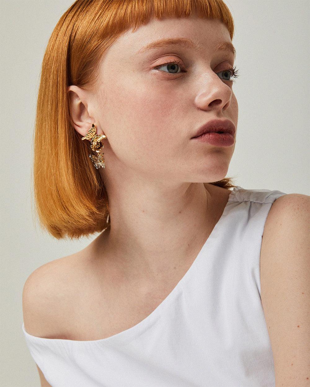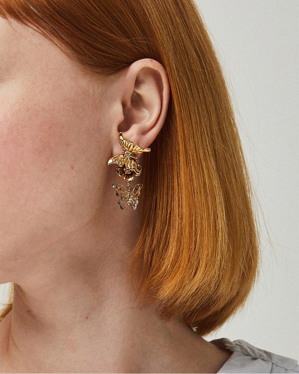 Delicately crafted, these earrings bring the lively harmony of butterflies and flowers to life.