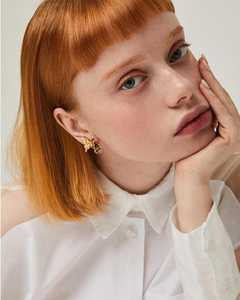 Earrings that beautifully capture the elegance of a butterfly resting on a flower.