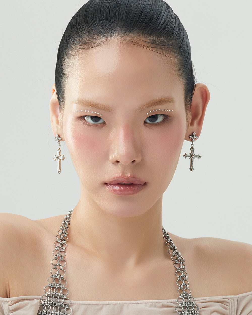 Drop earrings with intricate cross details, capturing a romantic gothic mood.