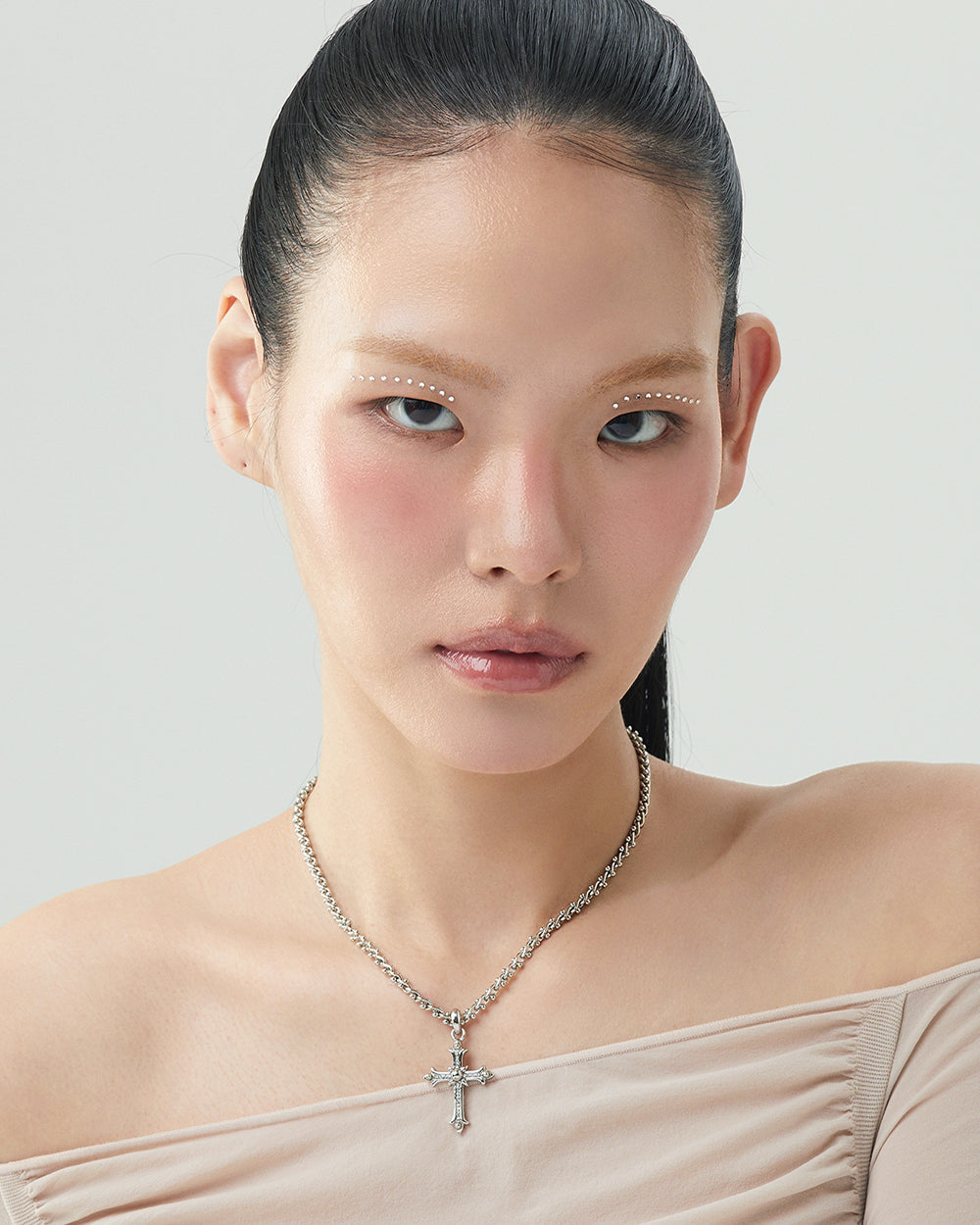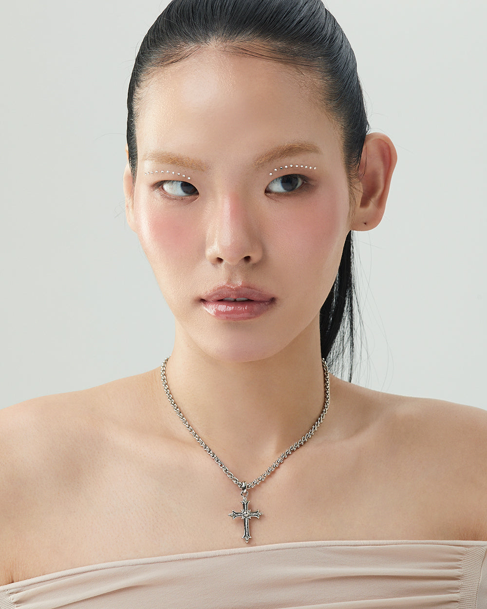 A pendant necklace with intricate cross details, capturing a romantic gothic mood.