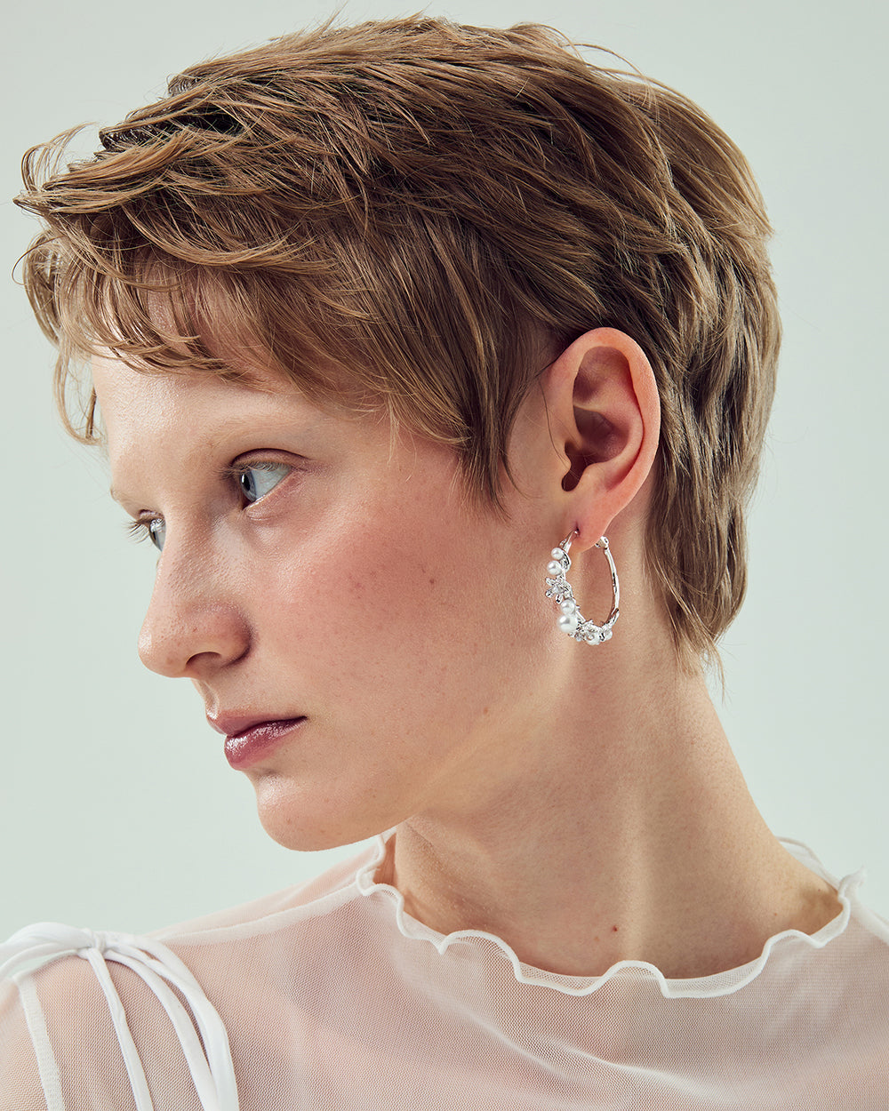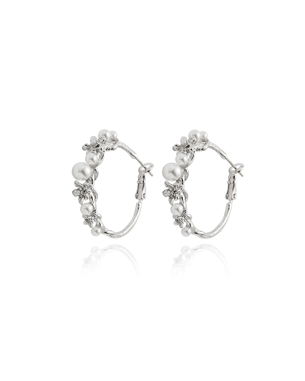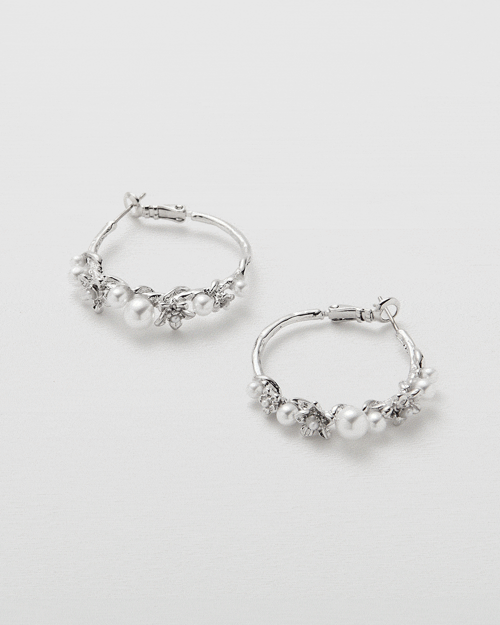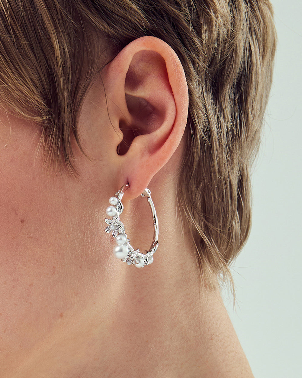 Like dewdrops nestled between petals, pearls bloom on delicately graceful hoops.