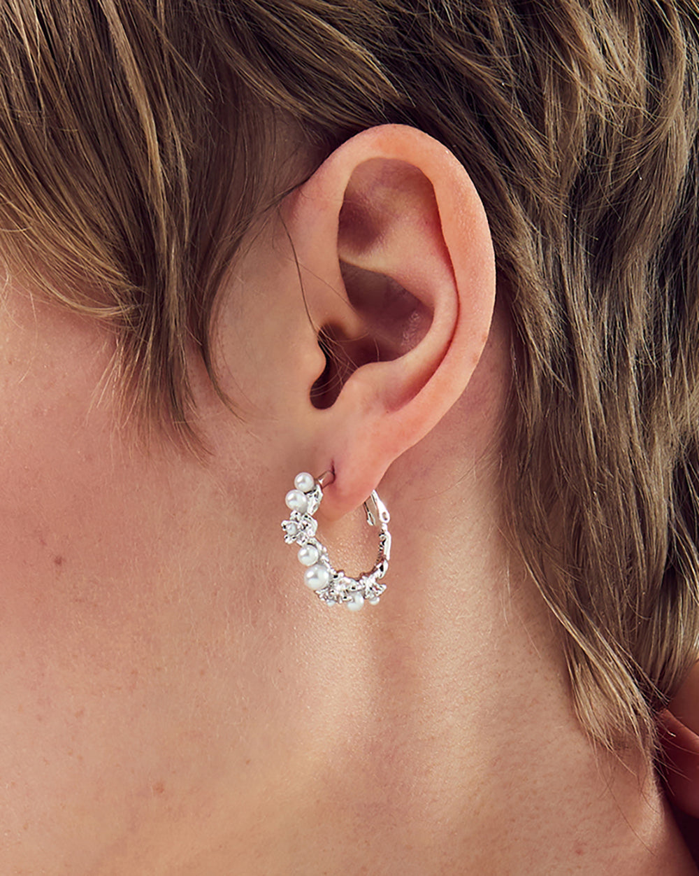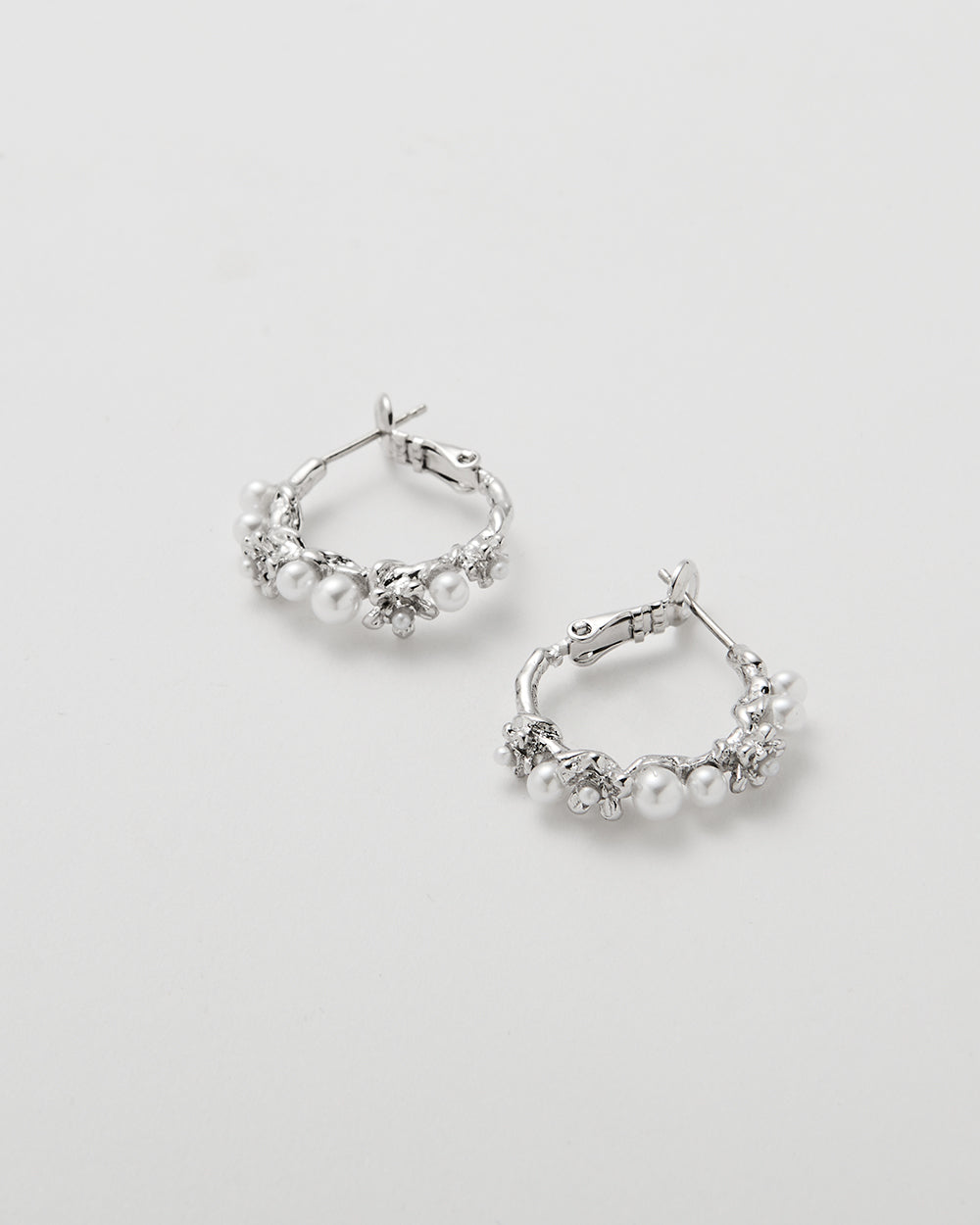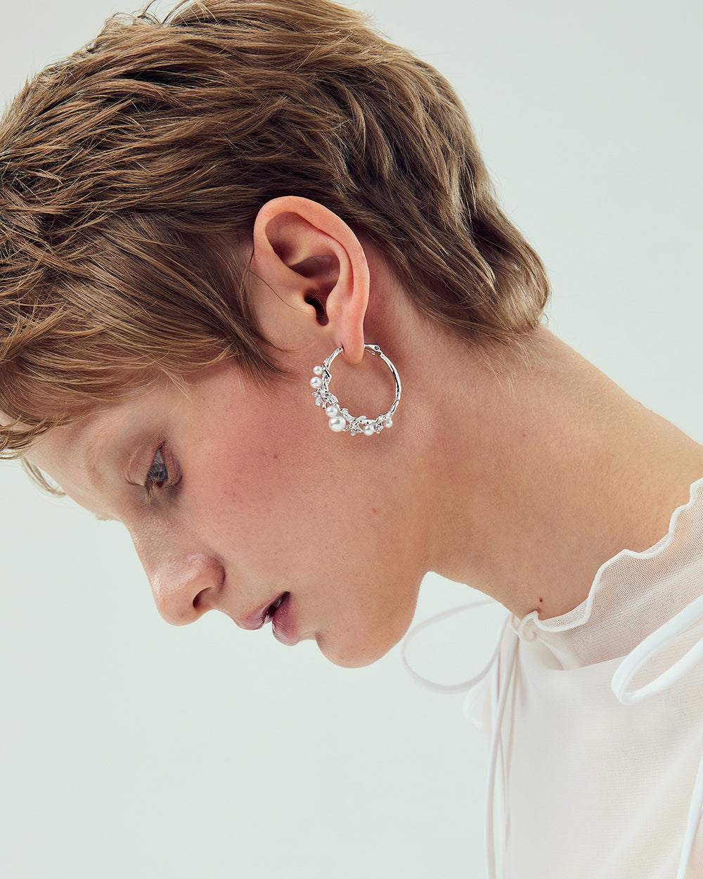 Like dewdrops nestled between petals, pearls bloom on delicately graceful hoops.