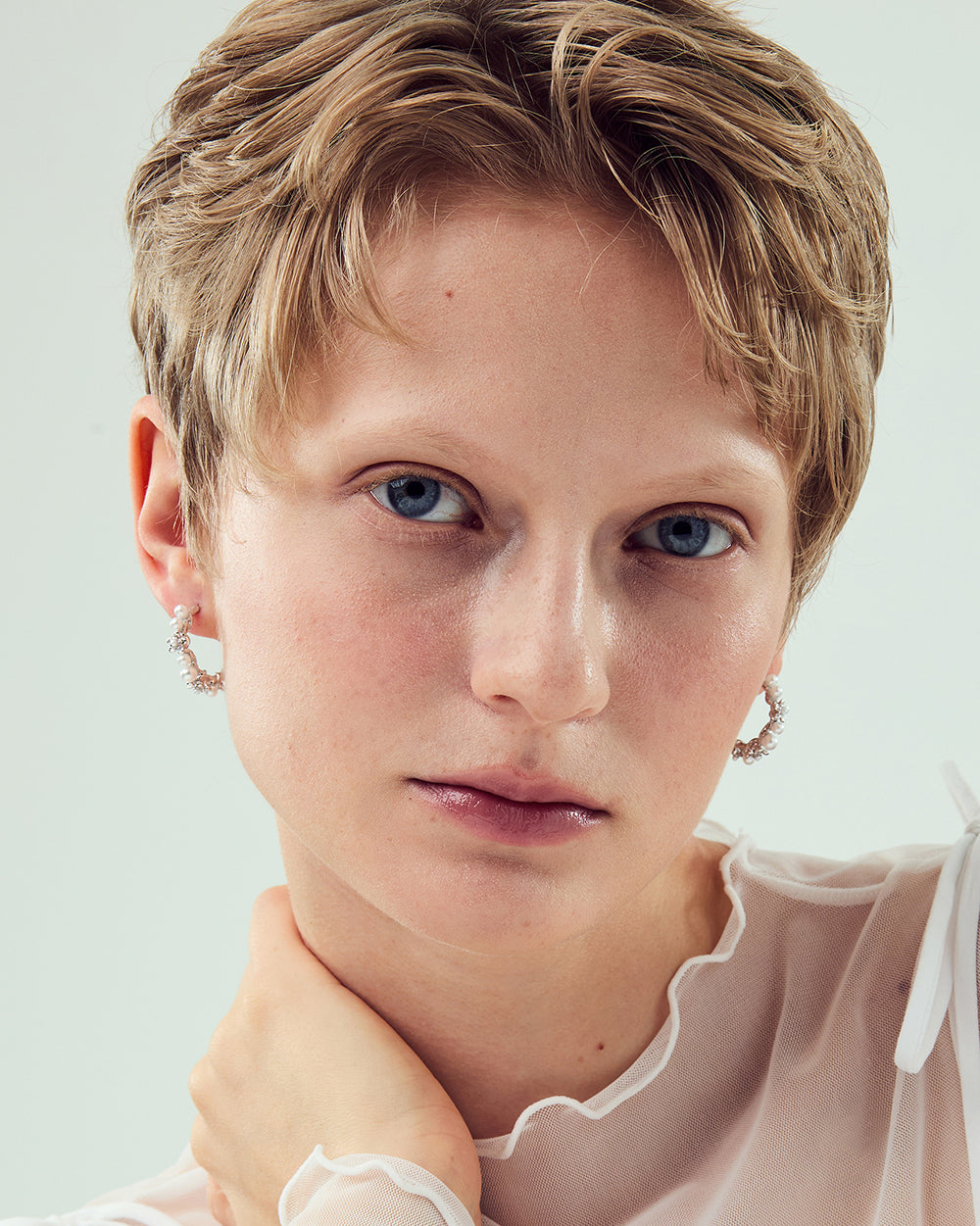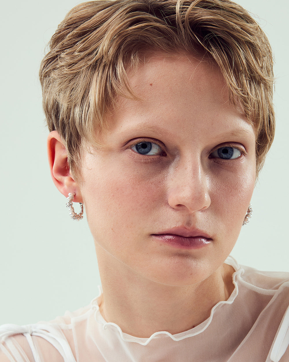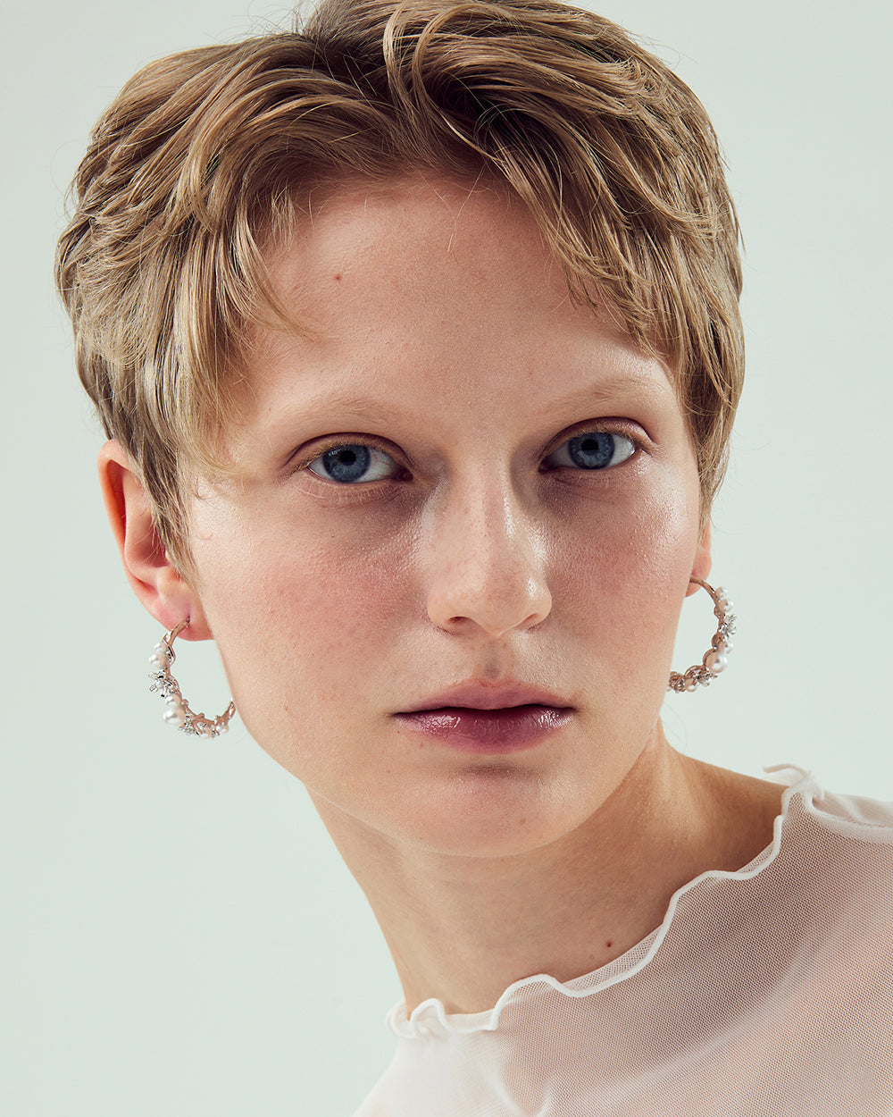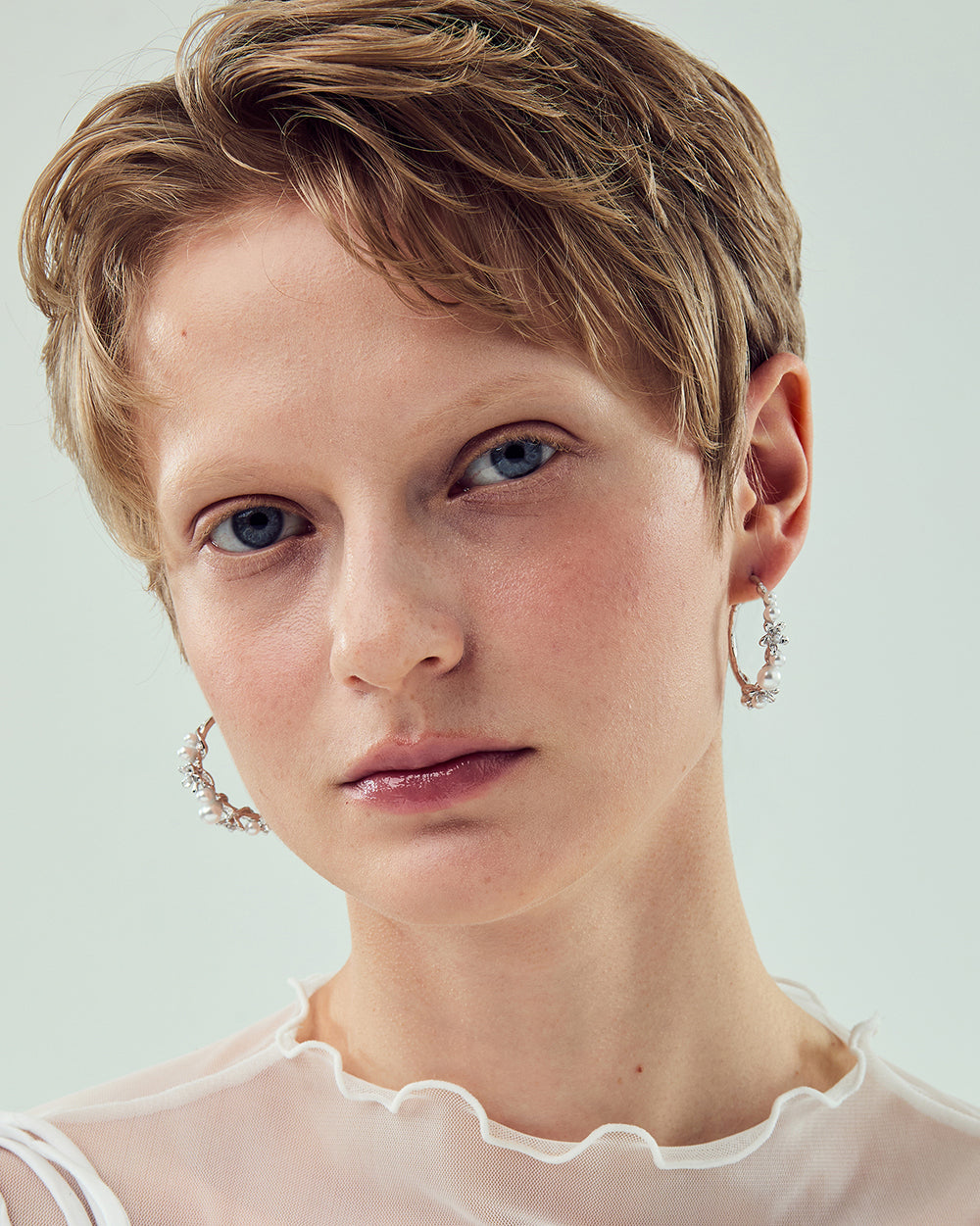 Like dewdrops nestled between petals, pearls bloom on delicately graceful hoops.