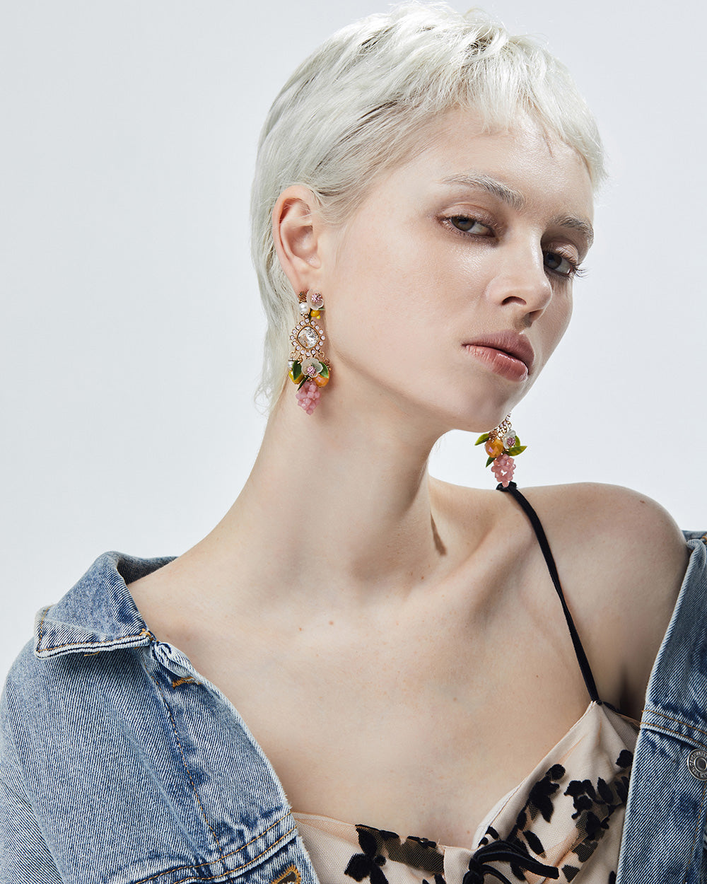 Stand out with these crystal earrings, featuring vibrant berry motifs and couture details.